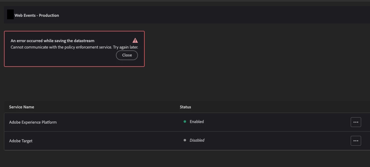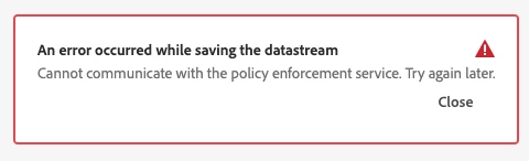 - I'm getting this error when trying to enable Target on a datastream in my staging and production sandboxes, but not my development sandbox: "An error occurred while saving the datastream. Cannot communicate with the policy enforcement service. Try again later."