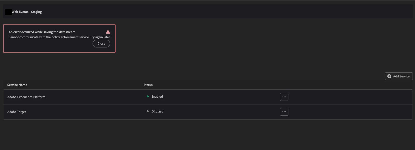 "Cannot communicate with the policy enforcement service" error when trying to enable Target on a datastream