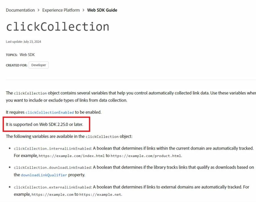 Hi, was looking at the adobe documentation and it says that clickCollection object is supported on Web SDK 2.25.0 or later. The latest alloy version is 2.21 based on the Releases · adobe/alloy (github.com). Does that mean that we can't set this obj and have to wait till 2.25.0 ? Could someone clarify please ?