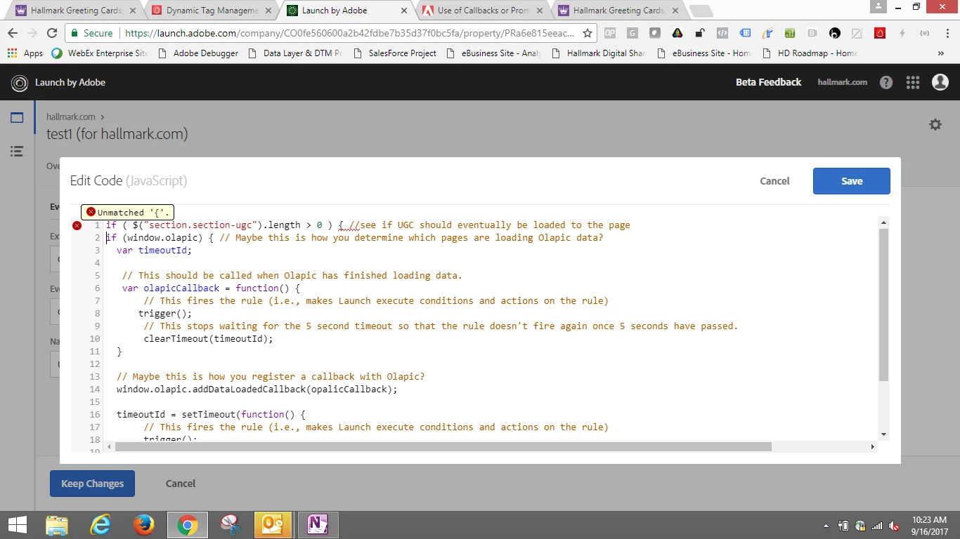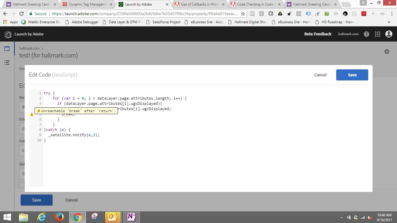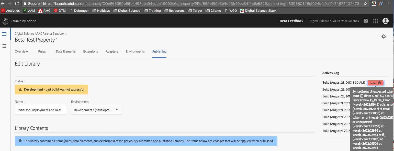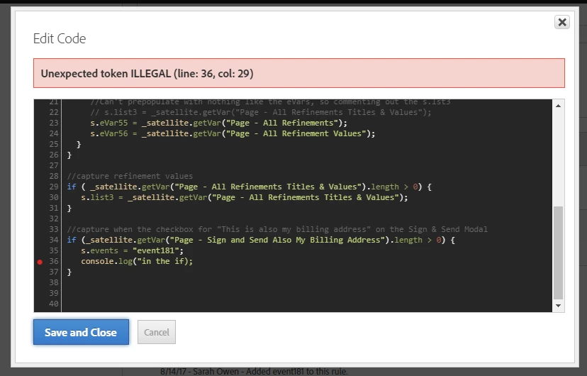 I REALLY, REALLY like in DTM that when I make a silly mistake - like forget the ending " in my console.log() in the below screen shot - that I am warned and notified of the line of code that is causing an issue (see screen shot 1 below).