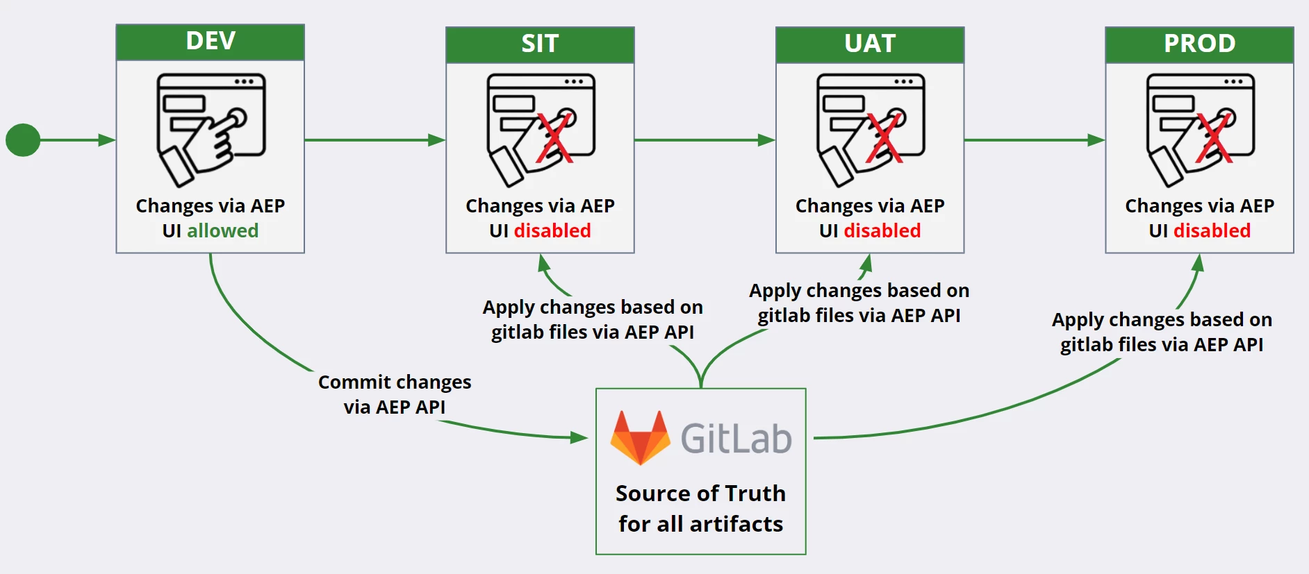 We’re considering a hybrid approach where UI changes are allowed in DEV, but once validated, they must be committed to GitLab as files. All other environments (SIT, UAT, PROD) would only get configurations through GitLab files applied via the AEP API.
