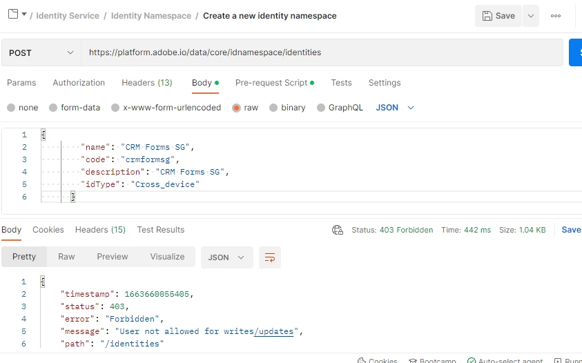 I am using Identity Namespace API to create custom identity but I am getting this error from postman