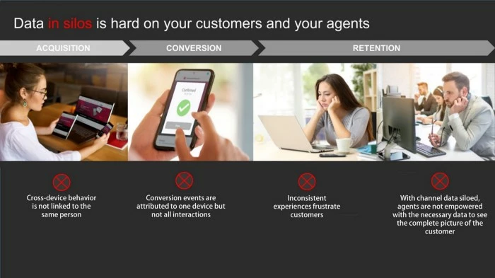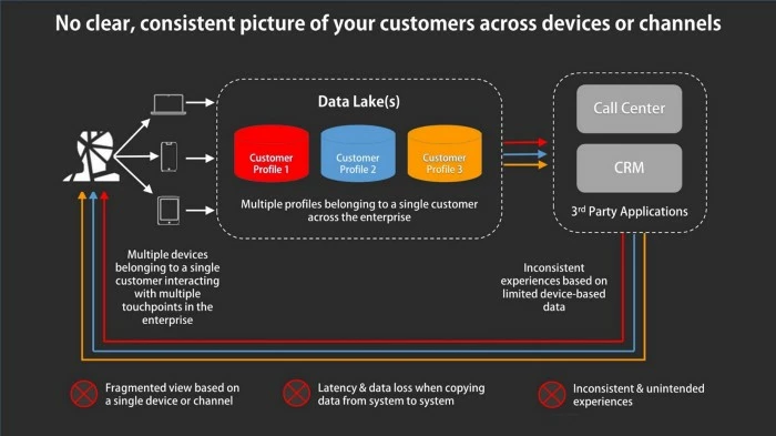 Developing a truly unified profile of the customer remains elusive because every customer is tracked separately in each channel as a unique visitor for every interaction across different devices and properties. When a conversion happens, it is attributed to only one channel. That attribution does not accurately represent the complete customer journey and all of the channels that may have been involved along the way. The information shared with downstream systems is incomplete. As a result, the customer has inconsistent experiences across devices and people interacting directly with customers in real-time have a harder time providing assistance when needed.