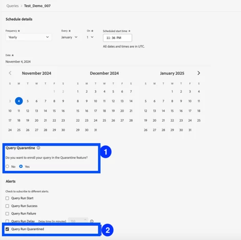 - Enrollment Process: When creating a schedule, users can enroll their queries in the quarantine feature. This opt-in approach allows for targeted resource management.