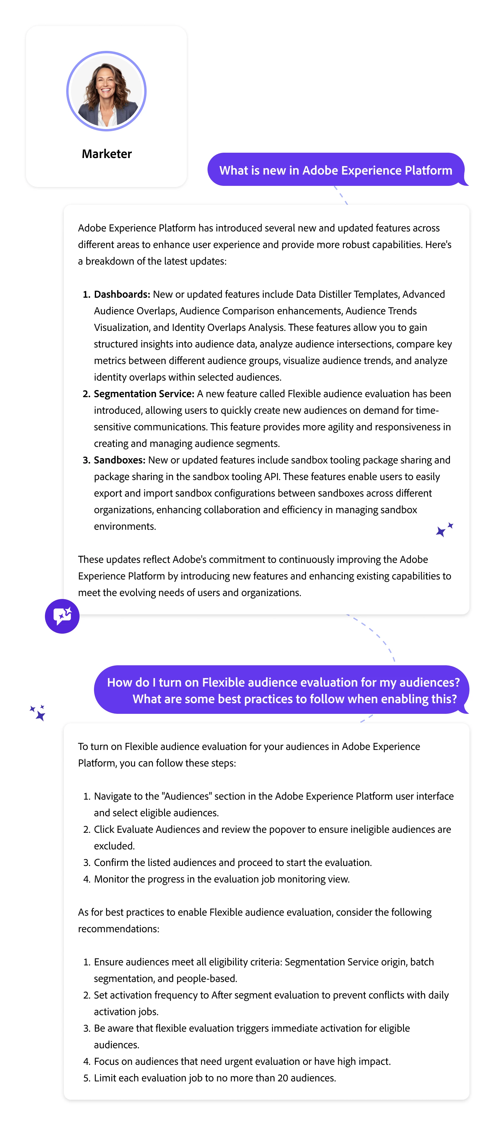AI Assistant is your right-hand helper in Adobe Experience Platform. Instead of searching through release documents or relying on others, you can ask AI Assistant directly, “What’s new in AEP?” and get a relevant list of recent releases that align with your work. You can drill into one feature to see how it applies to your use cases. AI Assistant can even walk you through step-by-step instructions to implement the feature effectively, without you having to navigate extensive documentation.
