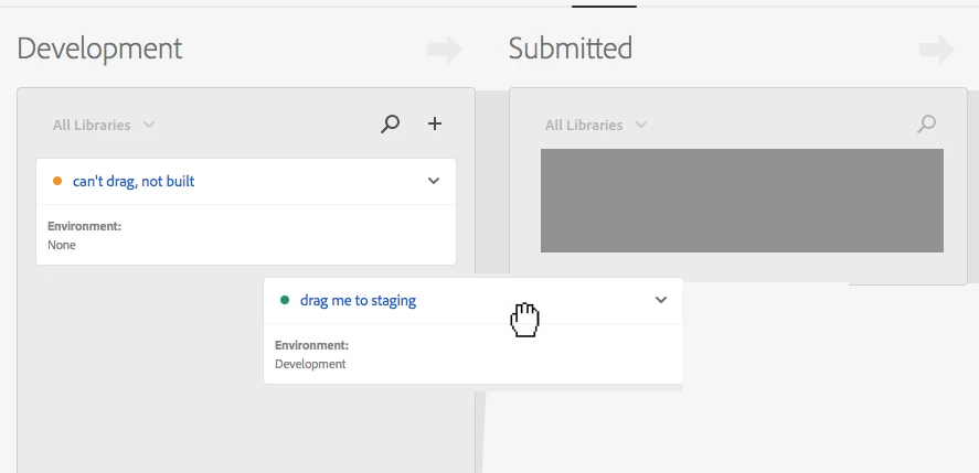 I would like to drag and drop successfully built (green dot) libraries through the publish process. I think the swim lane design affords this pretty well and would save some clicks and scrolling.