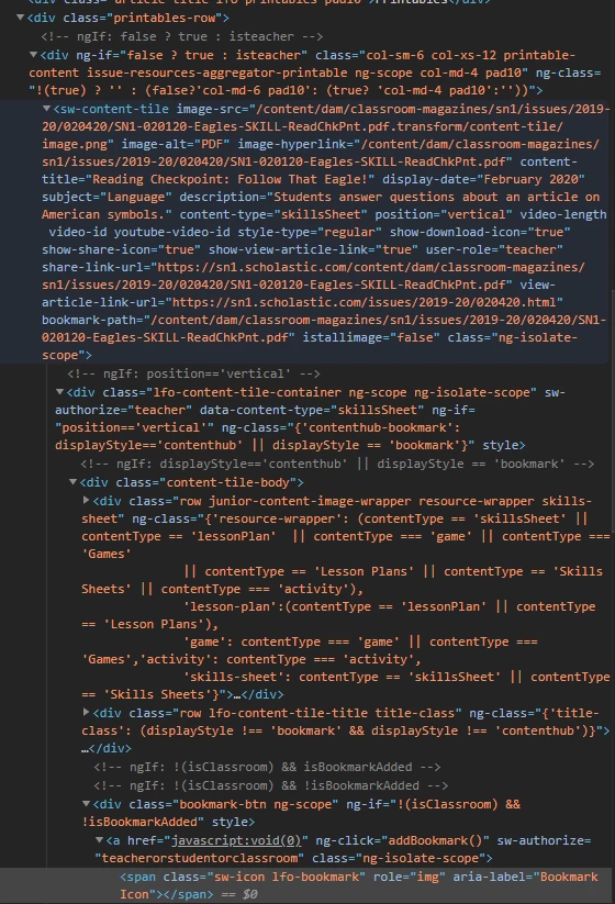 I have a CSS selector applied directly to an element (span.sw-icon.lfo-bookmark) that's firing an event. I need to get some values that are 4 parentElements up. When I console.log more than 2 parentElements, I get a 'null' message [in the screenshot, console.log works successfully up until the div with .bookmark-btn]. The site is done in Angular which I think might be the issue. I tried setting an evar, but didn't get anywhere with it.
