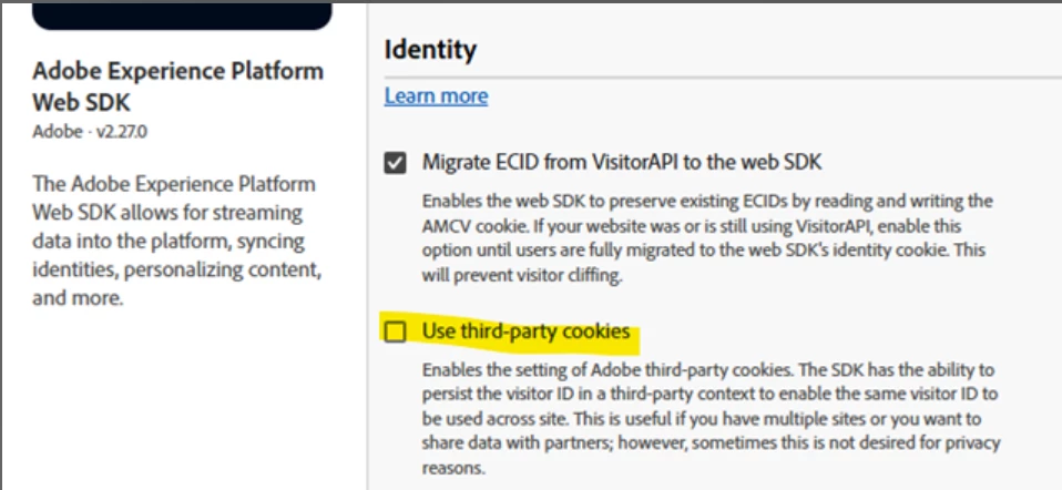 - For variables: disableThirdPartyCalls & disableThirdPartyCookies - In WebSDK, we can enable/disable from "Use third-party cookies" setting within Identity section of Web SDK extension.