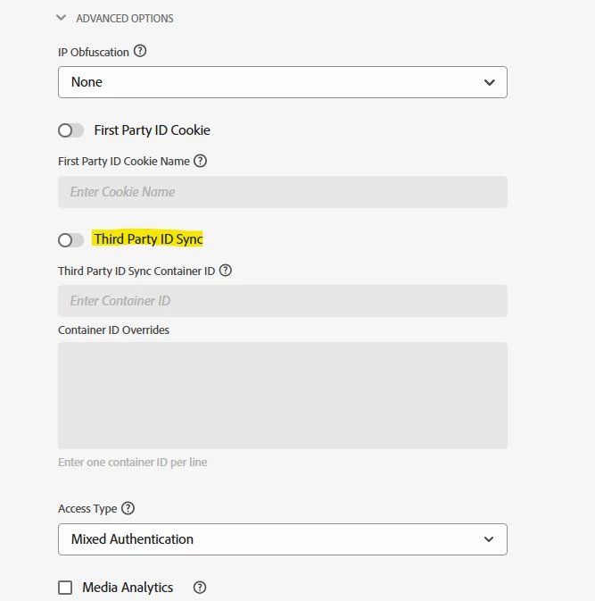 - Same goes with disableIDSyncs in WebSDK, we use toggle button "Third Party ID Sync".