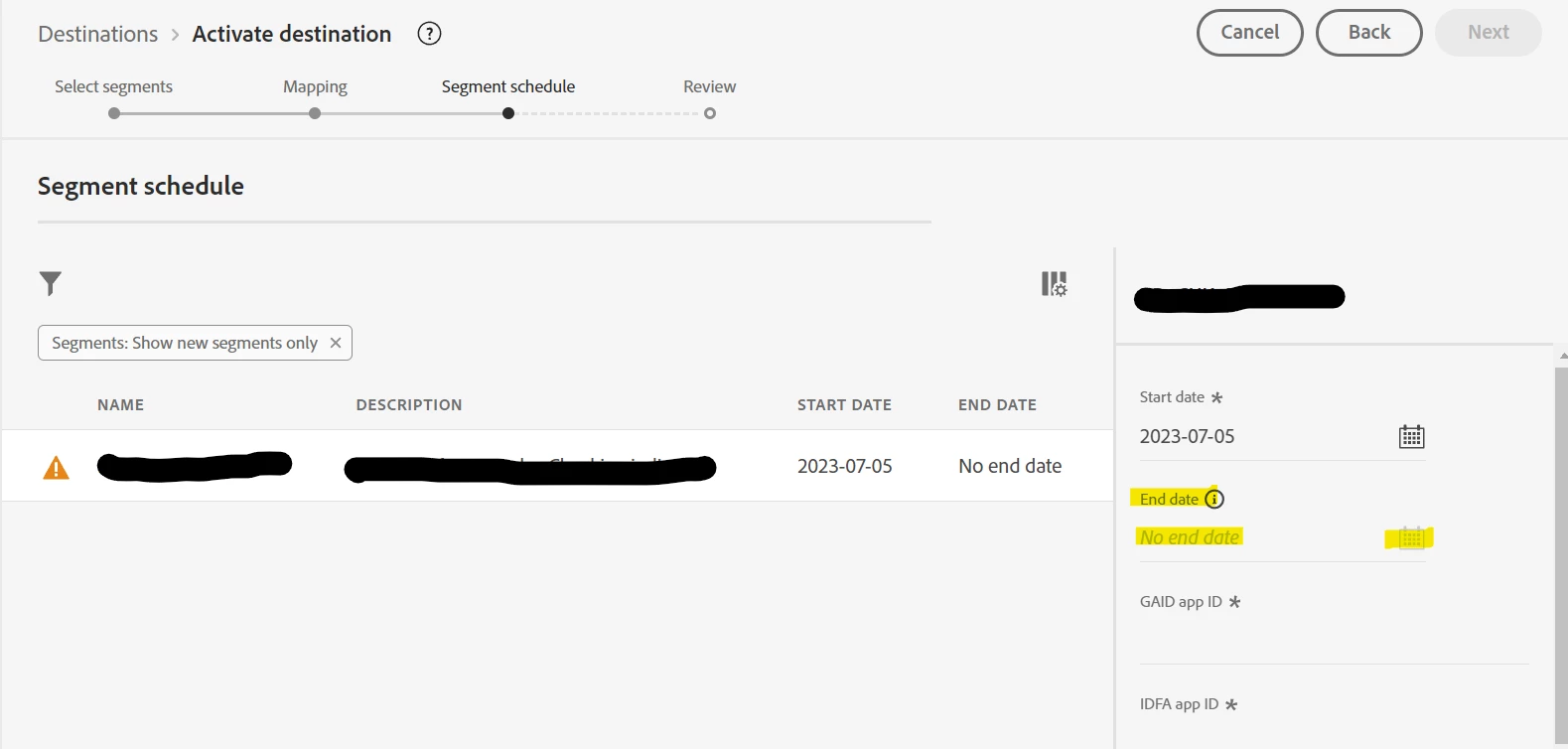 End date for segment schedule