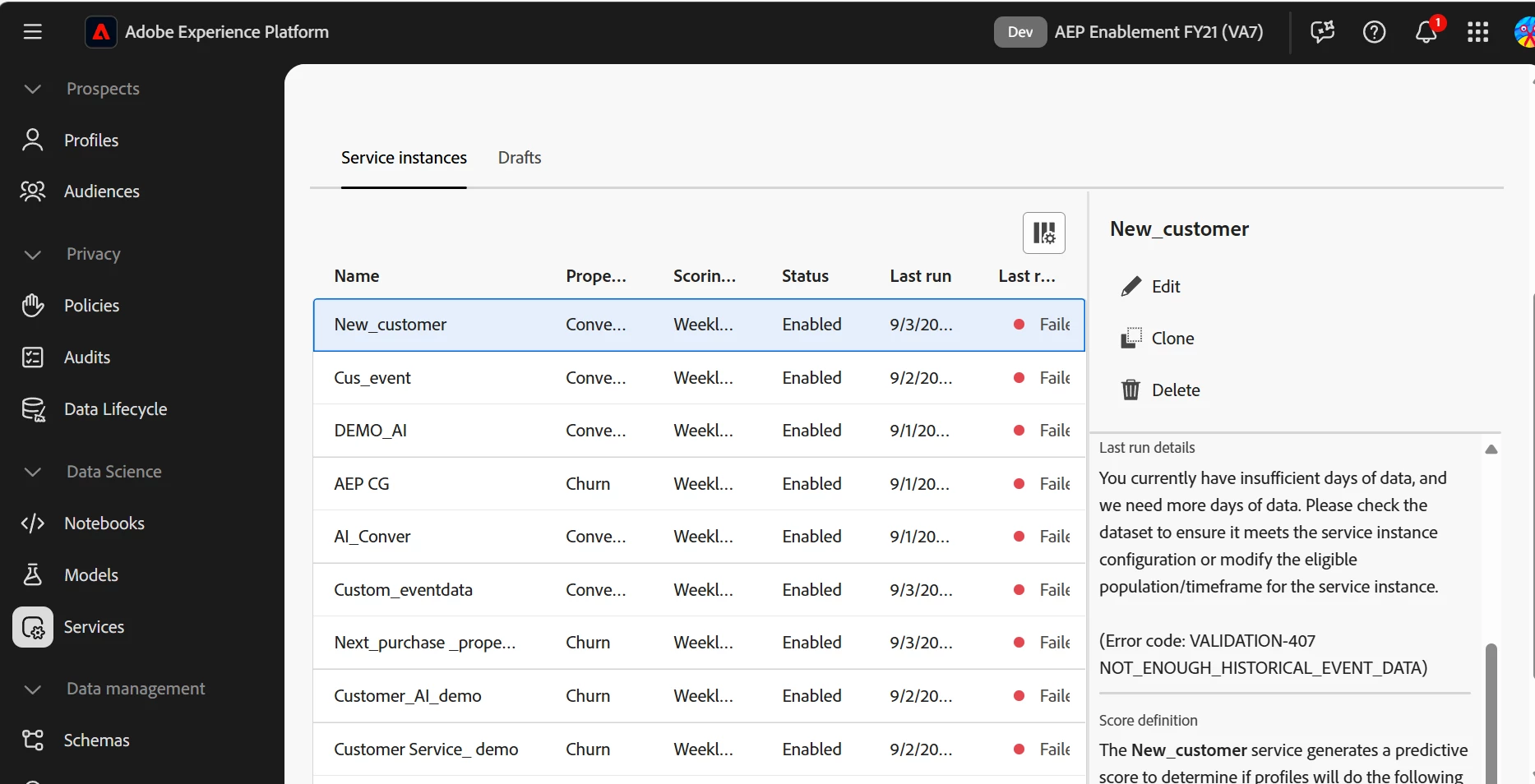Error VALIDATION-407 while creating Customer AI instance – Not enough historical event data