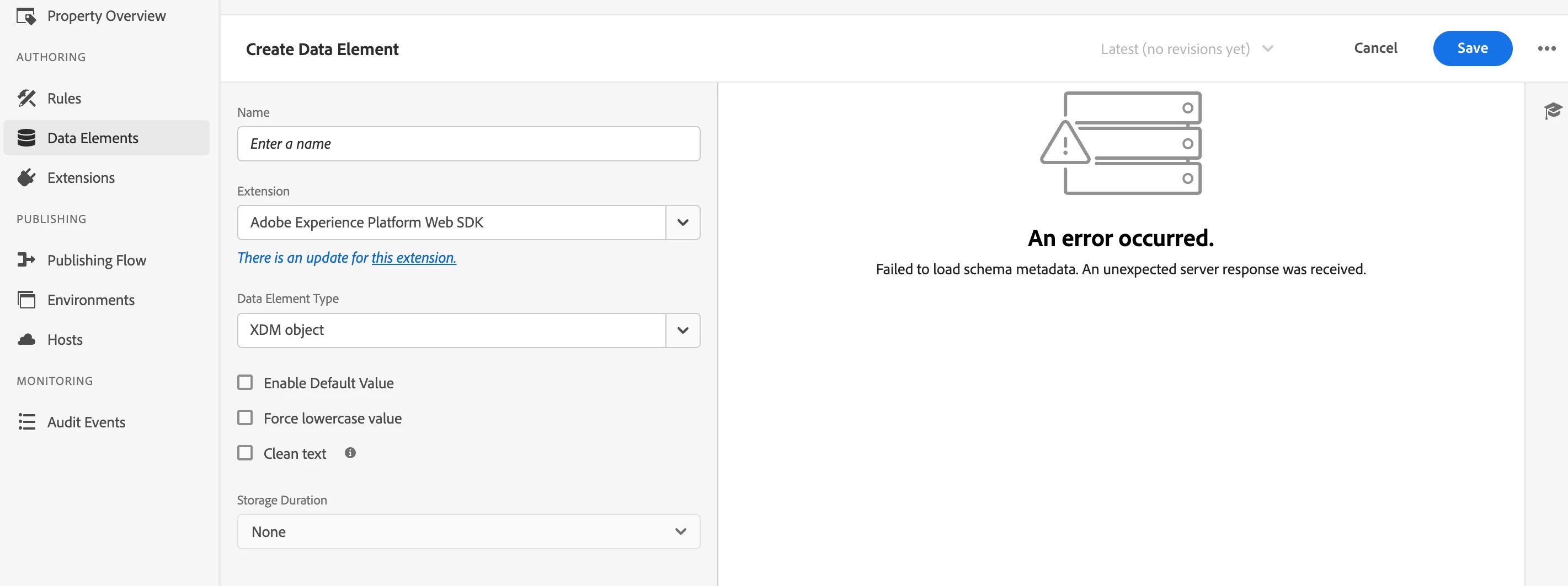 I'm currently facing an issue with the AEP Web SDK Extension in Data Collection—it doesn't allow me to create the XDM Object Data Element needed to map variables to my schema.