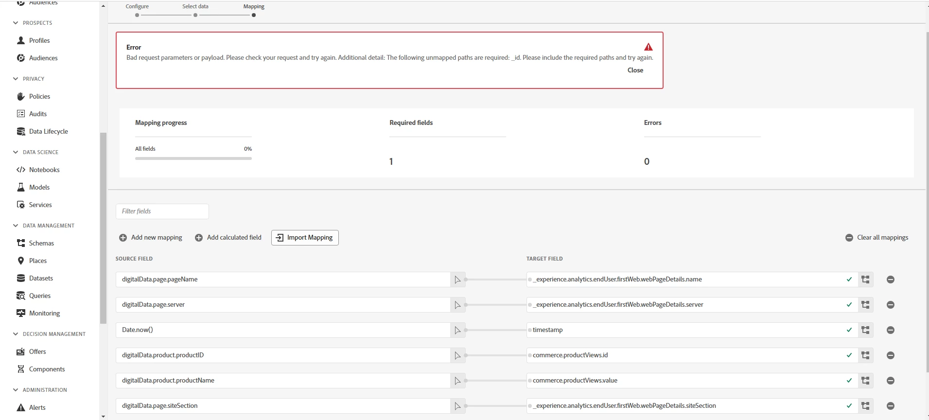 Data prep in datastream requires mapping for _id and timestamp fields always to be there as these are required fields of the ExperienceEvent class. This is the reason that when you start with data prep these two mappings are already there as below,
