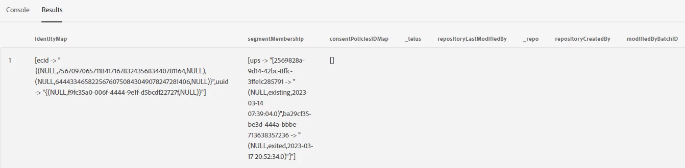 - Figure out what the fields are for the NULLs under the IdentityMap & SegmentMembership column, what would the query look like?