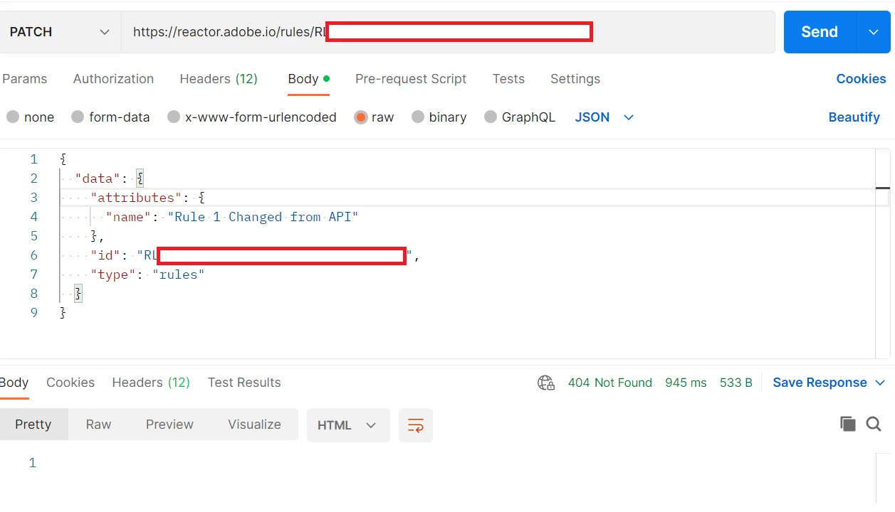 Rule ID: When making the API request, ensure that you use the correct Rule ID. It's likely that you're using an old or inaccurate Rule ID, resulting in a 404 Not Found message.