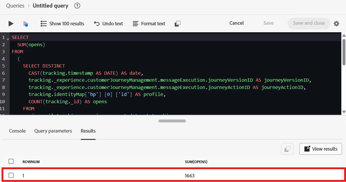 I have been trying to get the metrics that are obtained by Journeys reporting in Journey Optimizer, such as number of messages sent per messaging node, number of messages bounced per messaging node, etc, however, I get values that, in most cases, are close to what the reporting shows, but not exact. Next SQL statements tries to get number of messages opens per date, per Journey Version ID, per Journey Action ID, per profile (BP):
