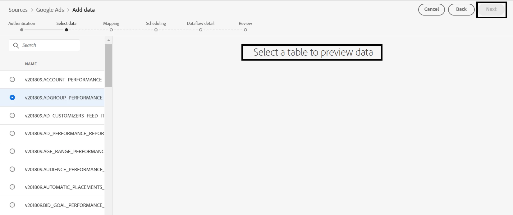 Have given the required credentials to connect, however the tables are not available for the preview making us not to proceed to the next step. Any inputs would be helpful, thanks.