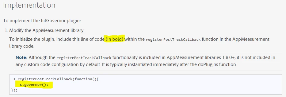 The first part (registerPostTrackCallback) instructs AppMeasurement to call s.governor after every beacon is sent to AA.