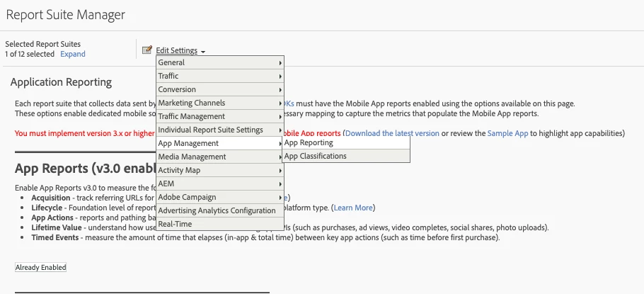 You can confirm in Analytics in the Admin as above. If it states Already Enabled (as above) solution variables and reporting are configured, otherwise you may need to Click Button "Enable Latest App Reports" to generate these dedicated variables.