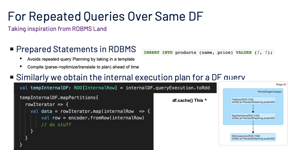 The dataframe.queryExecution.toRDD returns the Spark Physical plan which is the downstream step after the Analyze and Planning Step. We intend to hijack this step and reuse it.