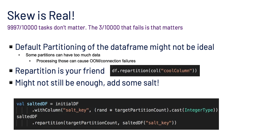 Data skewness is a problem that usually surfaces once you get your application out into the real world. Given the dynamic nature of it, just throwing more resources at it might not be an ideal solution. In Spark, it does not matter that 9999/10000 of your tasks succeed, the 1/10000 that failed will block the progress of your job and eventually fail it.