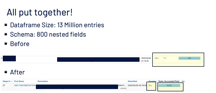 The Spark dataframe has 1000’s of simple or nested columns. For example, simple columns like churnScore or nested fields like person.gender, `optInOut, or channels.directMail. Just printing the Spark query plan causes an overflow while printing to logs in debug mode. The time for query planning takes more than 2–3 seconds on average and in some worst cases up to 7 seconds. This makes a significant impact while submitting interactive queries when the total runtime of the query is less than 10s end to end from the time of query submission.