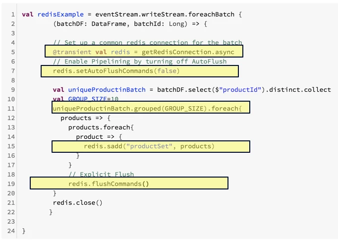 This means we are effectively able to micro-batch sending commands to Redis without having to actually wait for an ACK. This is a very important property in the case of mapPartitions since we are iterating through a partition in a linear fashion, we can group together multiple changes before issuing a blocking wait for an ack from Redis. That way Redis handles the queuing on the server-side. In the example below, we can see how we use the grouped(BATCH_SIZE) operator to effectively batch together changes for a group of rows before sending it to Redis.