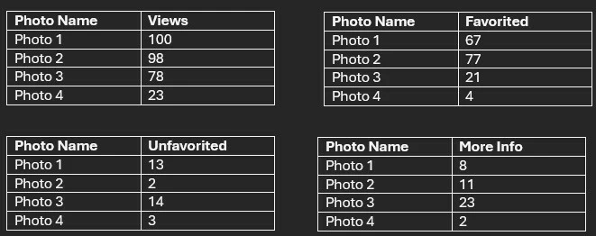 I'm trying to figure out how to capture instances of a photo that has been clicked on. That's simple. Where I'm getting lost is the user can also "favorite", "unfavorite", "share" or "more info" the photo. Ideally, I'd like to be able to have one table in CJA workspace present the data in one table, for example: