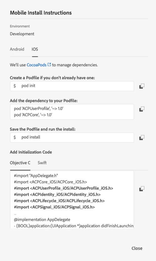 For each environment that you create, Launch will generate a set of installation/initialization instructions that work with familiar dependency managers such as Maven and CocoaPods. When you use one of these dependency managers in conjunction with your application build, you no longer have to go and pull down a version of the SDK or any extensions. The dependency manager will go out to each linked source repository and make sure that you are getting the latest approved version for deployment.