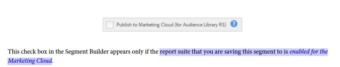 I was trying to publish my analityc segment to the AMC (target in particular) and I can not see the button "Publish to Marketing cloud" in the Adobe Analytic Segment Manager, I found in the doc that I need to enable my report suite for the Marketing Cloud (you can see the attached image). My question then was... How can I make my report suite available for the AMC ???????