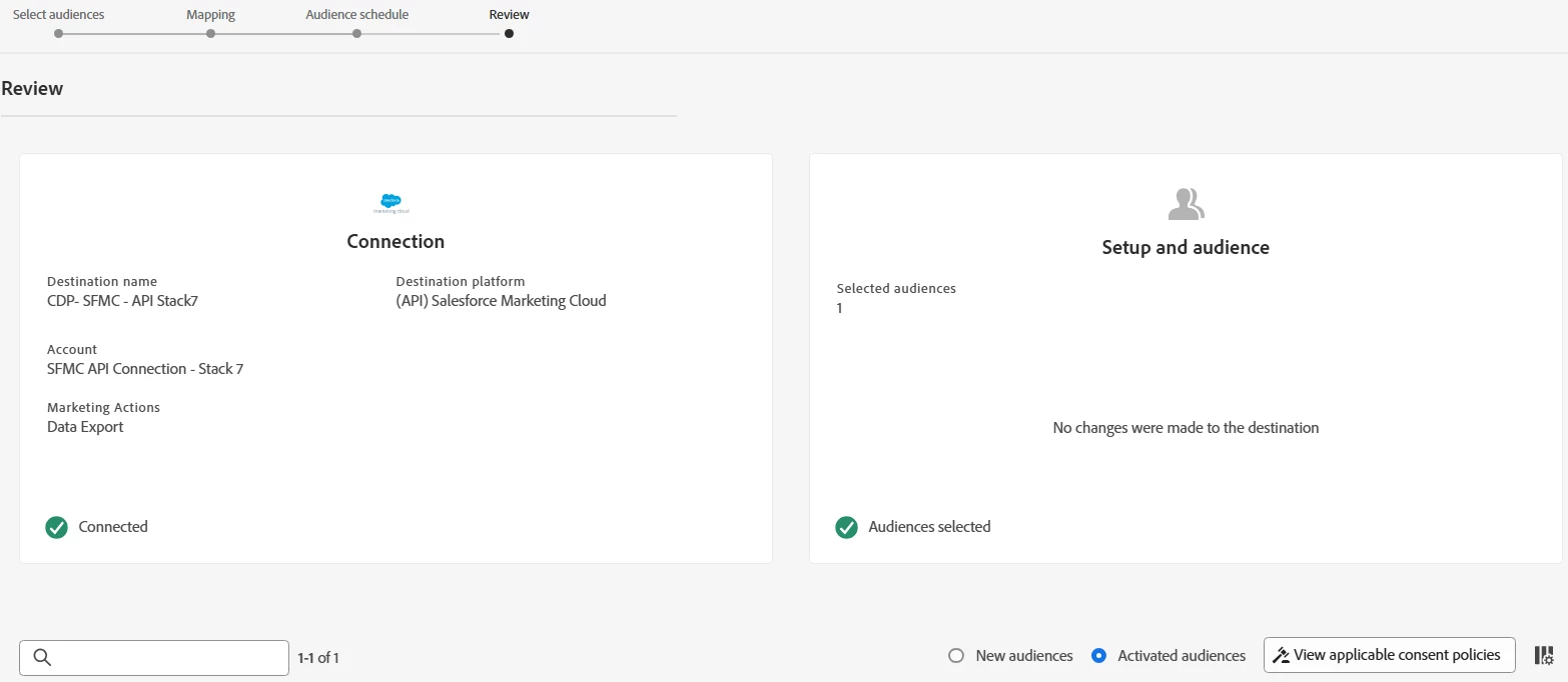 I am working on AEP-SFMC API based destination connection. I have created a streaming type audience and activated it using SFMC API based connection. SFMC connection is set up successfully as I can see the target fields during mapping. On Audience activation profile get activated to destination.