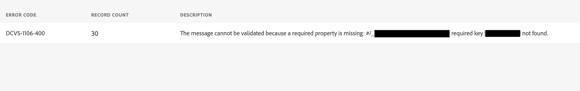 DCVS-1106-400 | 30 | The message cannot be validated because a required property is missing: #/_myorg/mySchema: required key [userId] not found. |