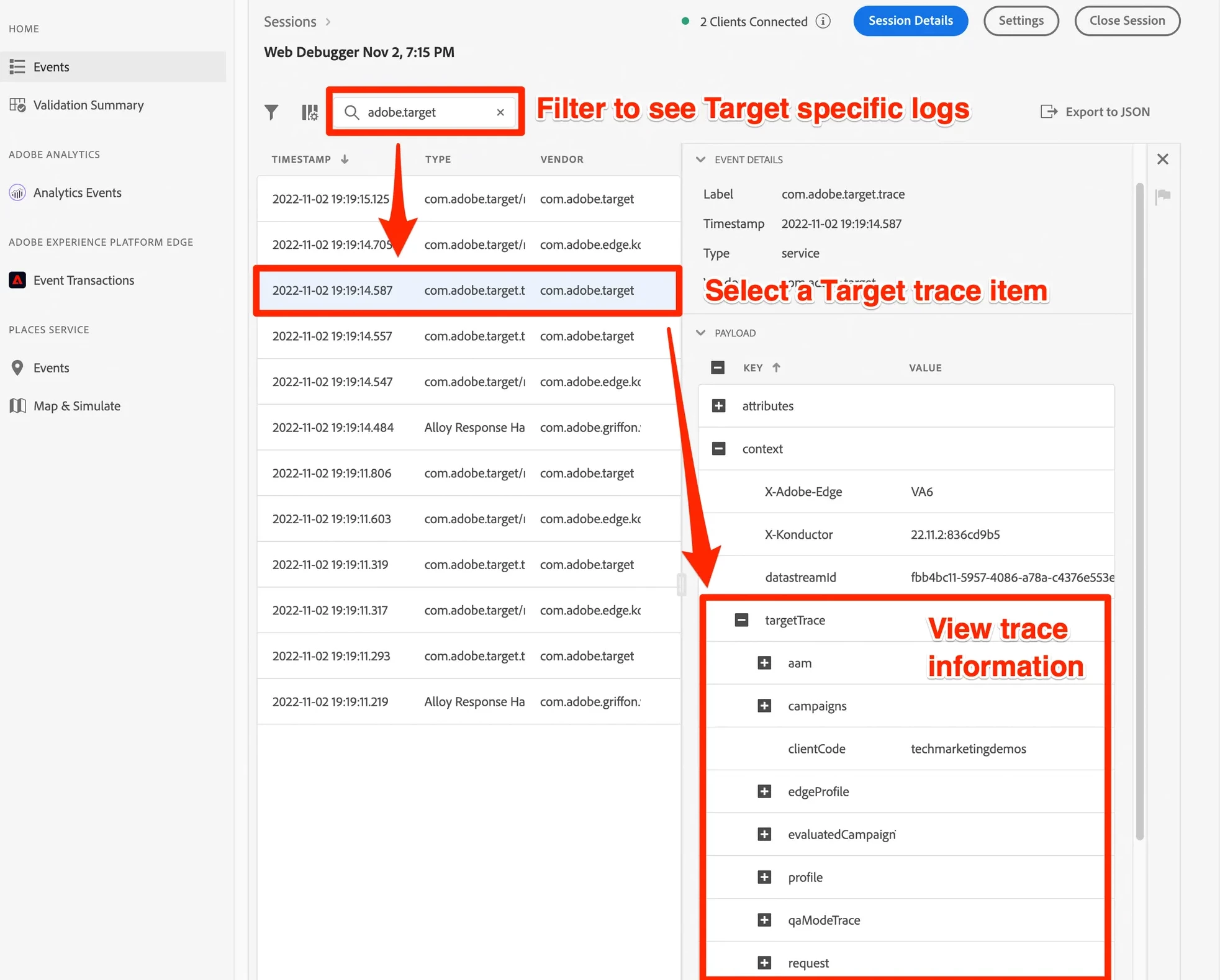 I'm trying to check if a Target container is sending the correct data to Analytics.