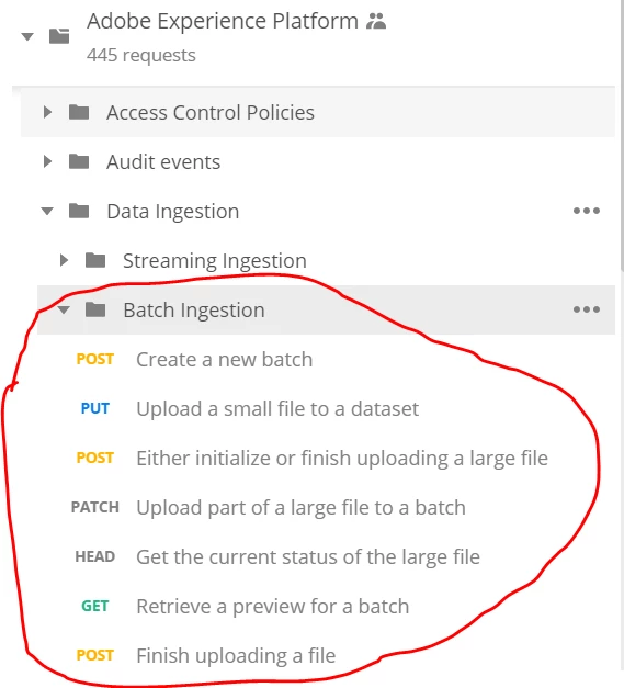 Before you test the data ingestion, you should use the postman collection as mentioned in point 2 (there will be a explicit node for Data Ingestion with all required API endpoints. I have also added a screenshot for your reference) and also create the developer console API project as per point 3 and extract the credentials (API key, client secret, and JWT token which are required to call API).