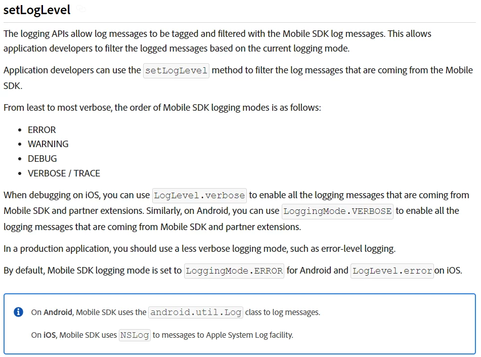 We have integrated Adobe Launch SDK (version : 1.+ ) in our android application, and during execution of the production version, some error exception log/details were found in the mobile app console logs. So, we wanted to hide or suppress any exposed Adobe error logs/details in the production version.