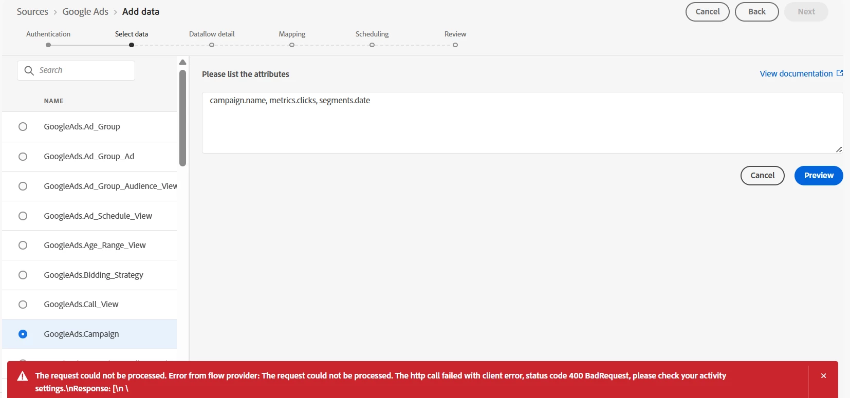 The "segments.date" 400 Bad Request Error: Initially, I tried to include segments.date in the attribute list for the GoogleAds.Campaign resource. This resulted in a 400 BadRequest error.