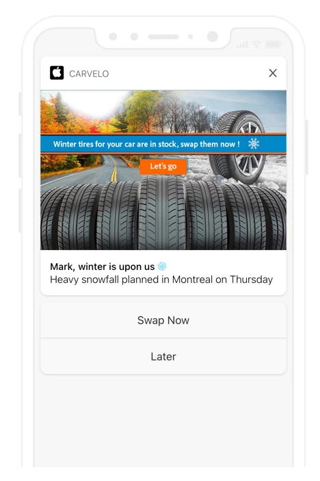 Carvelo marketing team is asked to leverage IoT / mobile apps data to propose proactive car service offers when a given vehicle is nearby a shop. Offers can be as simple as a discount on brake replacement if the car has not been serviced in the past 24 months or more complex such as an offer on winter tires when there’s a snow forecast in the Montreal area. Of course, such an offer should only be proposed if tires corresponding to the make and model of the car are available in the workshop.