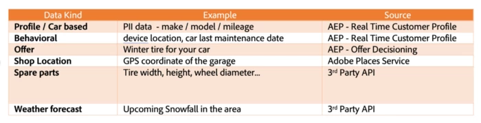 Customer and Event data are made available for immediate consumption in Adobe Experience Platform Real-time Customer Profile. Adobe Offer Decisioning has direct access and can lookup profile and behavioral data in real-time to determine if this winter tire offer is relevant for our customers. Shop location details are stored in the Point of Interest catalog, as part of the Places Services and collected as an experience event.