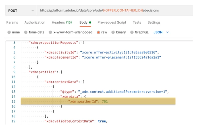 7. Offer Decisioning Engine looks for the next best offer for a given decision scope and uses contextual data coming from the payload of the API call to execute the decision. The weatherId attribute corresponds to the weather condition, as returned by the Openweather map API