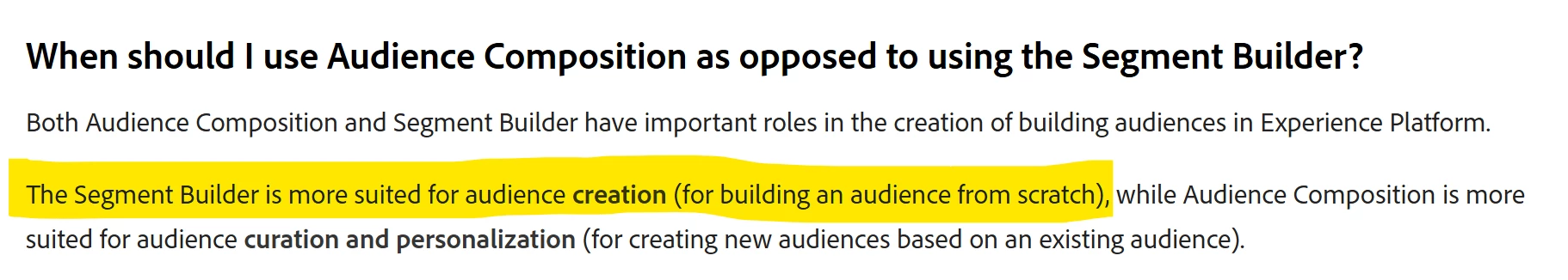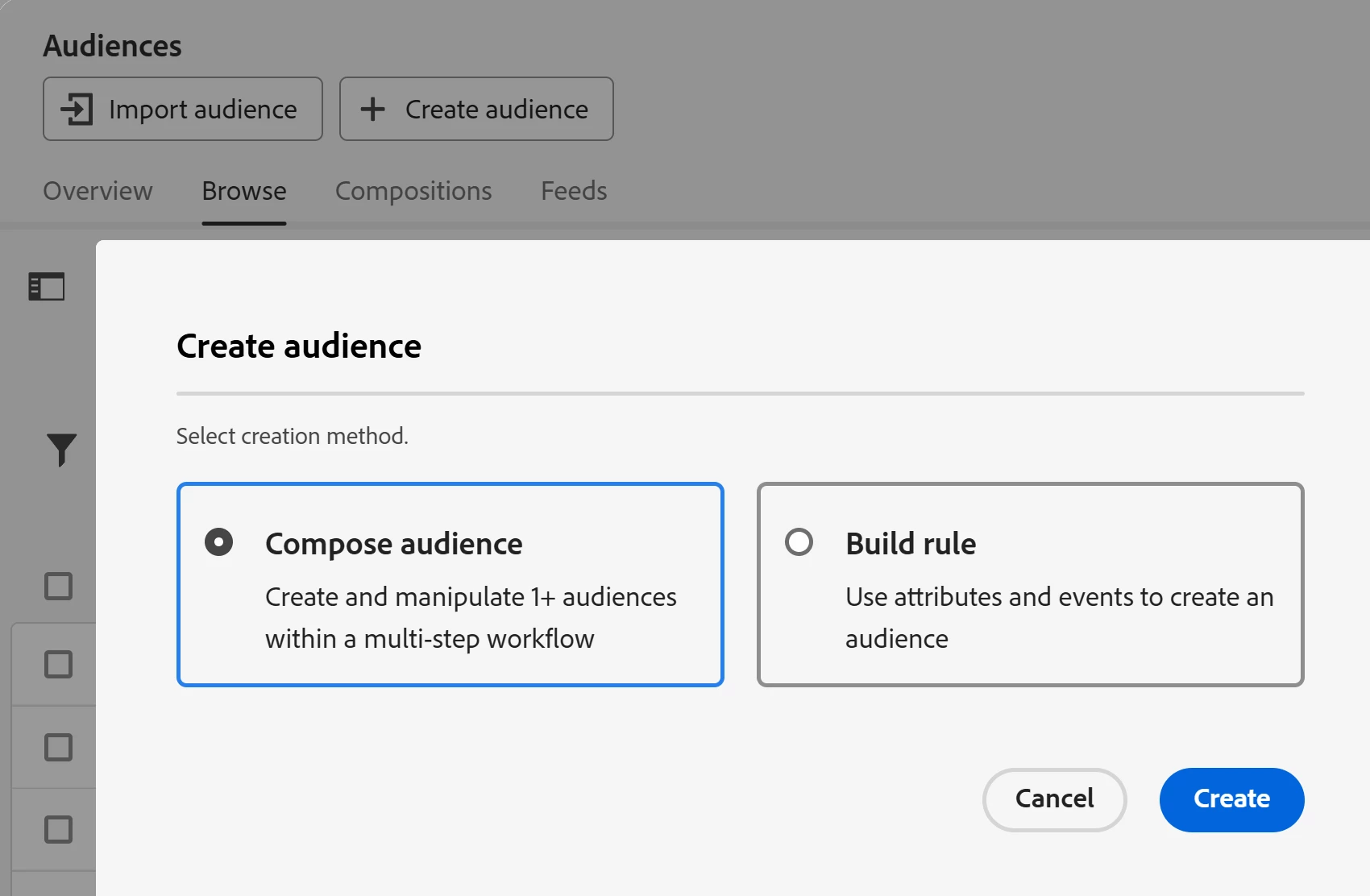 When you click to create a segment, you get a popup with "compose audience" and "build rule" options, with "compose" being the default pre-checked option.