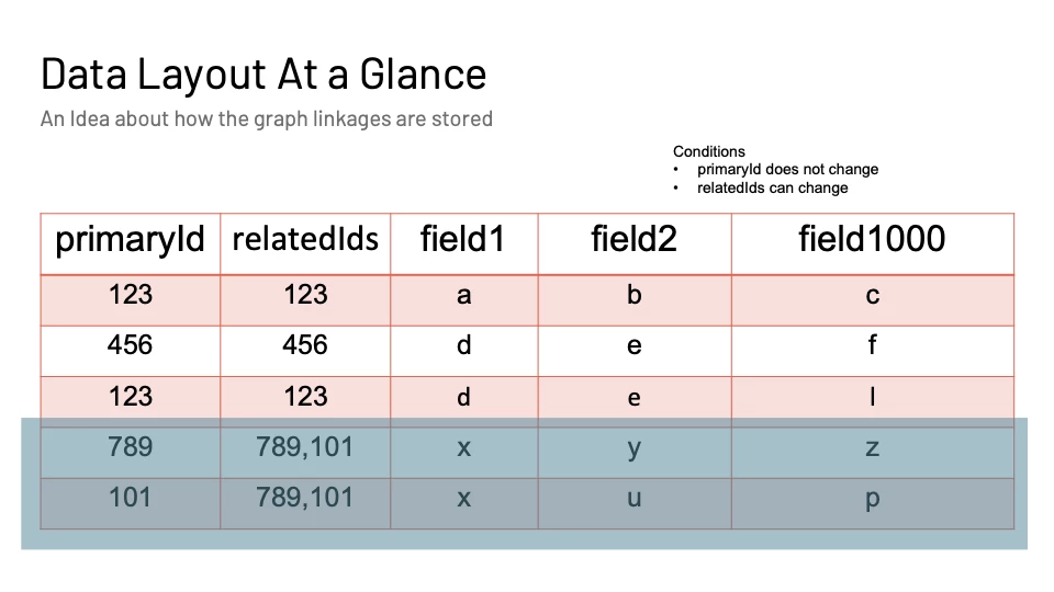 Before we go into optimizing our workload, let us take a look at a toy data example as shown in Figure 4. In the table, consider each entity having a primaryId. Any event generated by the entity will have the primaryId sent. Along with that if there is any extra information about the linkages, we will get the relatedIds that will also be populated. Focusing on the last 2 rows, we see that ids 789 and 101 are linked to each other. This tells us ALL records pertaining to 101 or 789 need to have linkage information. Fields 1 to 1000 are data fields indicating some attribute about the event recorded in that row.