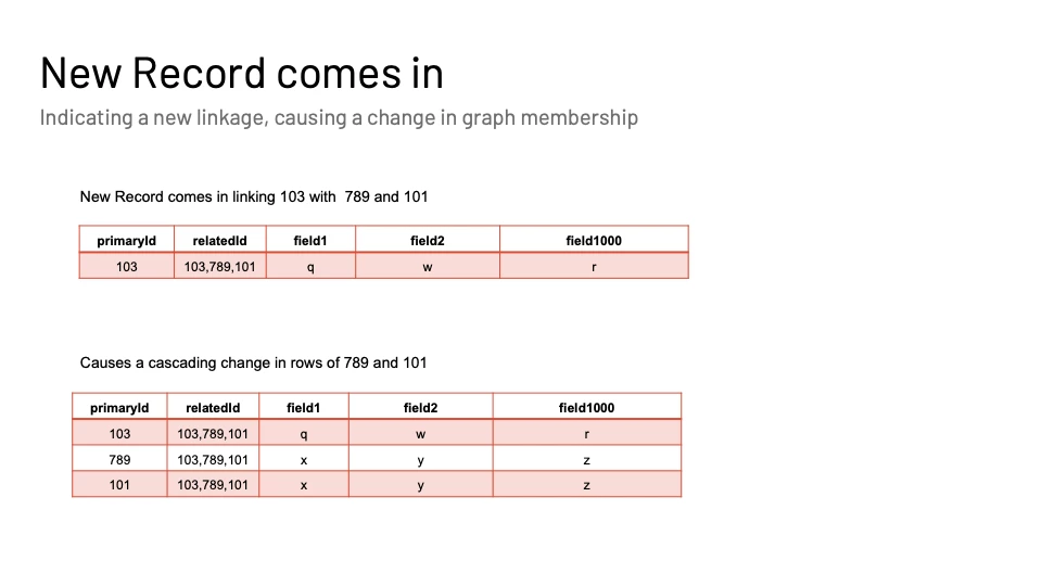 Since this is a dynamic system, we want to see how the data evolves as new data flows in. Especially when changes in linkages happen. Figure 5 shows an example where a new event came in for an id 101, interestingly enough it also contains linkage information showing it is linked to 789 and 101! This causes a cascading change in the records that have come before.