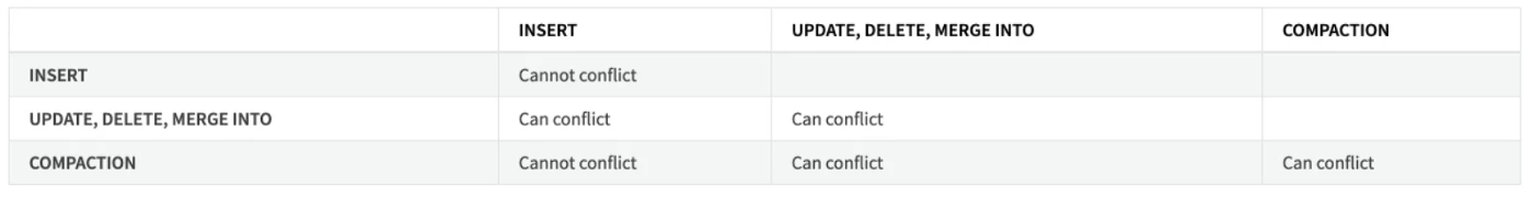 The table above gives a good idea as to what operations conflict with each other. Take away is that appends are safe with a multi-cluster writer. We DO need to take precautions in spite of the optimistic concurrency control provided by DeltaLake in the case of UPDATE DELETE issued from multiple Spark jobs.