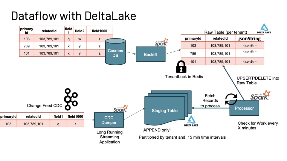 We will utilize these change feed messages to recreate a row by row copy of the Cosmos DB Hot Store on the data lake. As shown in Figure 9, we have a long-running Spark Structured Streaming Application called the CDC Dumper that consumes the change feed notifications that writes to a multi-tenant global Staging table in a APPEND ONLY mode. This ensures that we can expand on the parallelism of the CDC Dumper process without having to worry about write conflicts that we looked at in the preview sections. The Staging table is also a delta lake table which is partitioned by the tenantId and 15 minute time intervals.