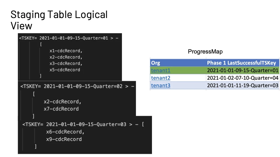 Figure 10 shows a logical view of how the staging table holds onto records within the time intervals. We also have a ProgressMap that is held on Redis to communicate how many records per tenant were written vs processed.