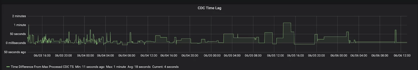 CDC lag from Kafka tells us how much more work we need to do to catch up to write to Staging Table. We can see how many minutes/seconds off we are from the time a CDC was produced to it being dumped into the Staging Table.