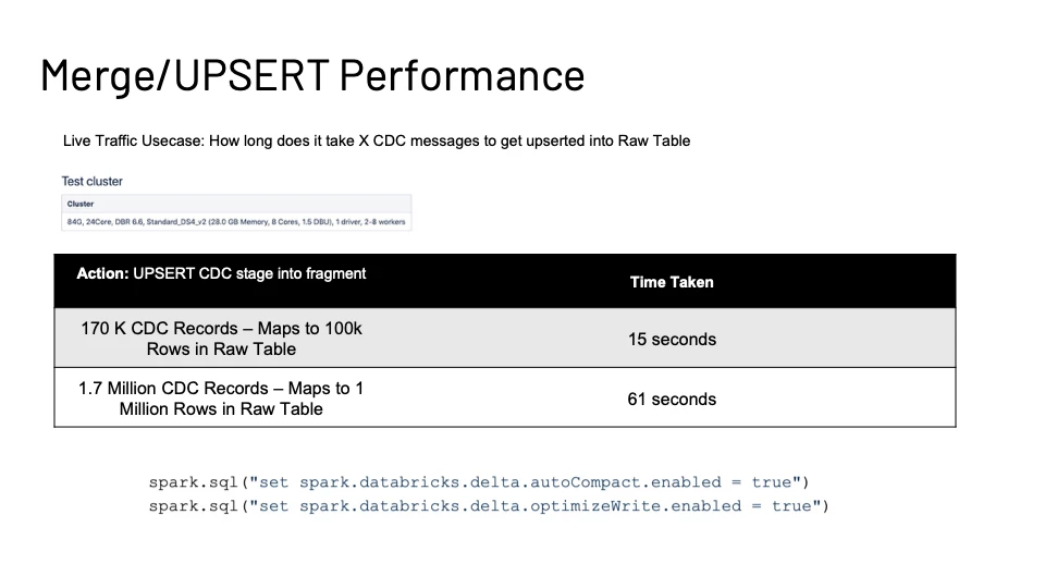 In the introductory sections and specifically in Figure 5, we emphasized the update amplification that can occur with our use case. We decided to put that to the test where we observed 2 scenarios as shown in Figure 13. We see impressive UPSERT performance even with a very minimal 24 core cluster.