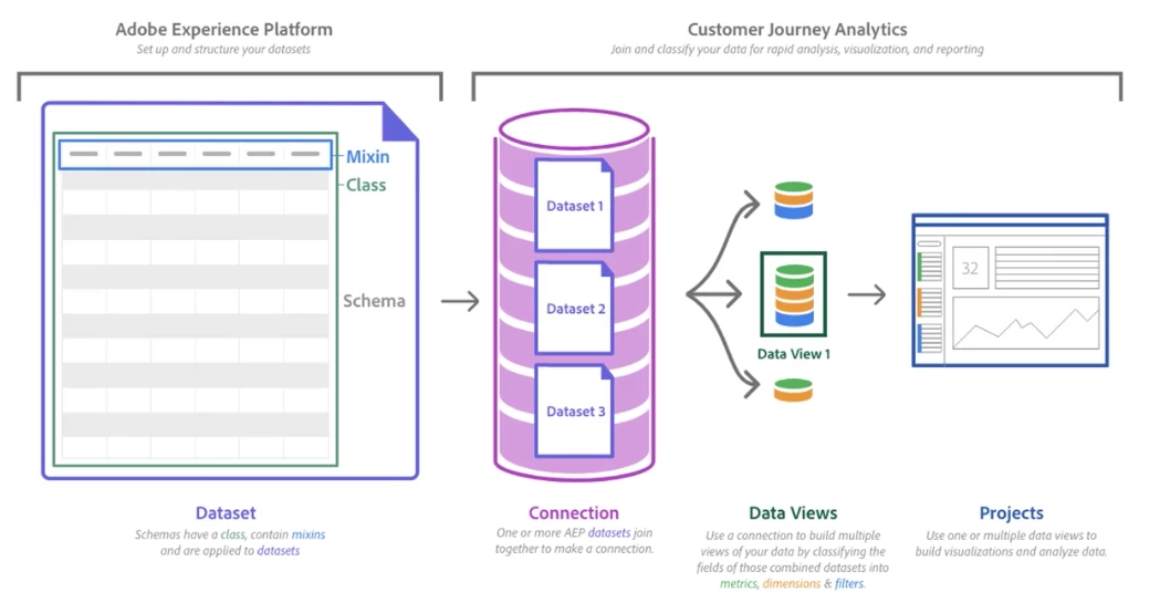Customer Journey Analytics is an application service built on Adobe Experience Platform (AEP) that lets you use the power of Analysis Workspace and combine it with various other data sources like online, brick and mortar, CRM, call center data, etc. Using the Experience Data Model (XDM), data can be uniformly represented, organized, integrated all in one place for reporting.