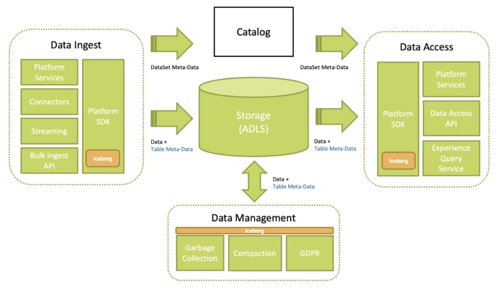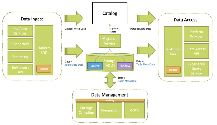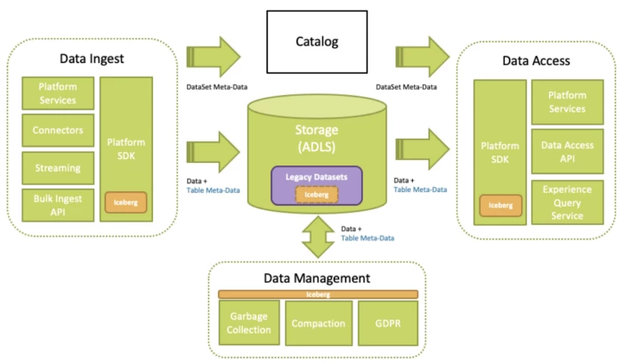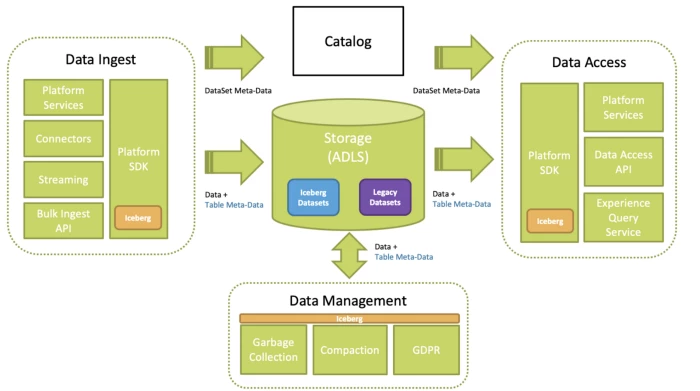 - We abstract the table format of the dataset in Catalog. This allows us to build Iceberg metadata behind the scene while the client can continue reading from this dataset in source format. We enable Iceberg for consumption once the metadata is generated for all ingested data.
