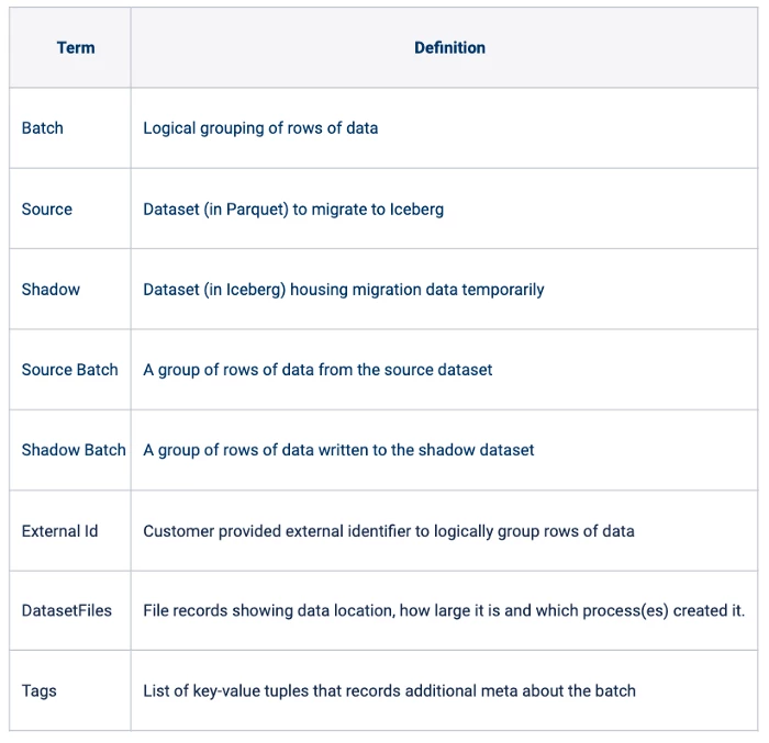 The Migration Service (MS) is a stateless, scalable, and tenant agnostic migration engine. MS is designed for migrating data on the Data Lake that has been collected by touch-points enabled through Adobe’s Digital Marketing Solutions. MS maintains a pool of migrant workers and each worker is responsible for migrating an Experience Data Model (XDM) compliant dataset to Iceberg. Each worker maintains an army of dedicated helpers that are tasked to fan out the migration workflow. For instance, we migrate multiple batches of a dataset simultaneously and at the same time, MS can handle the migration of many such datasets belonging to a single client. A client’s datasets on the Data Lake can be migrated by a single or a pool of MS instances. Let’s go over a few terms used in describing the migration workflow: